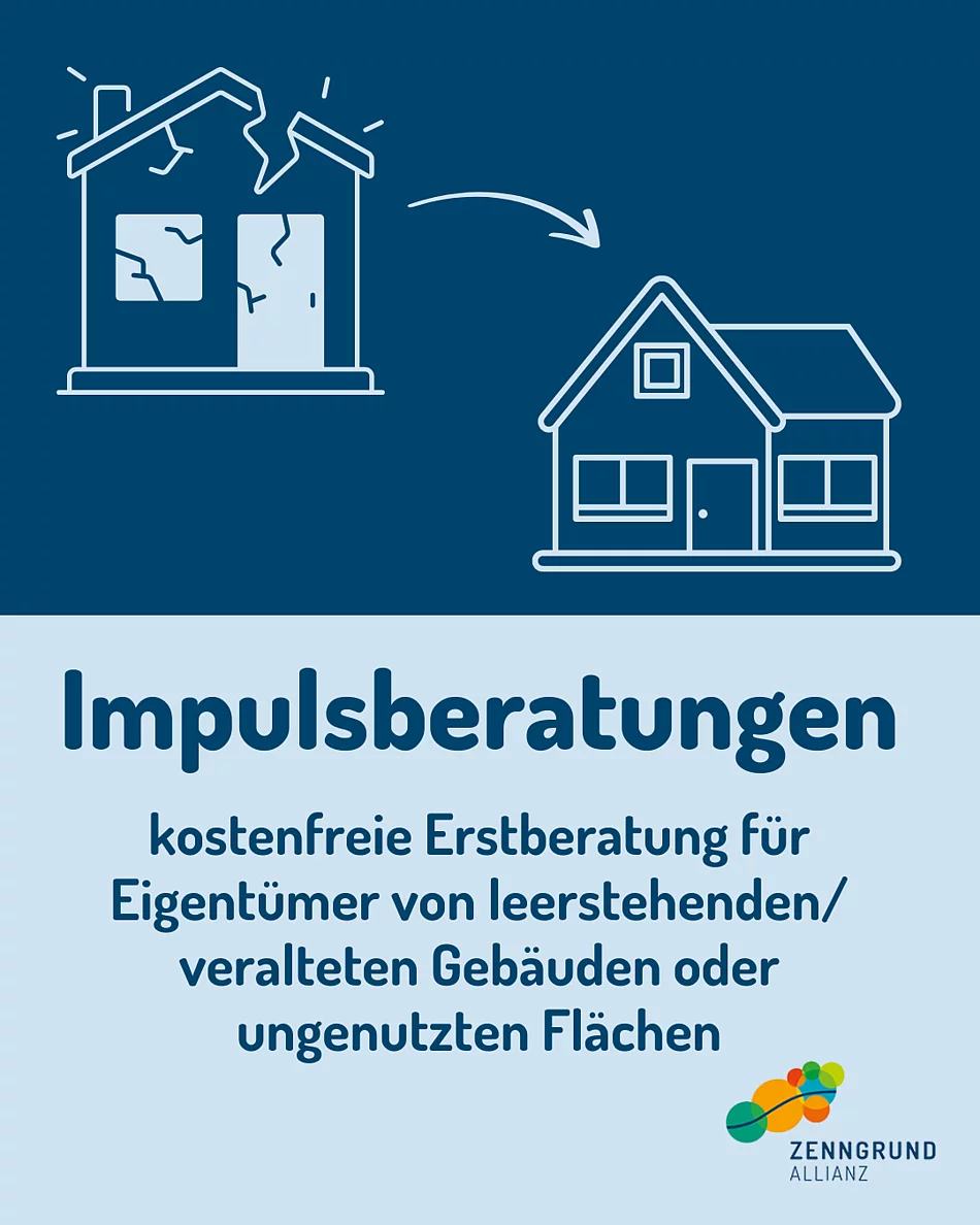 Die Eigentümer können sich hier eine fachliche Ersteinschätzung einer Architektin hinsichtlich zukünftiger Nutzungsmöglichkeiten einholen. Seit Dezember 2024 bietet die Zenngrund Allianz ihren Bürgern dieses Beratungsangebot an, welches durch das Amt für Ländliche Entwicklung Mittelfranken gefördert wird. Informationen zu diesem Beratungsangebot und anderen Angeboten sowie das Antragsformular finden Sie auf der Homepage der Zenngrund Allianz unter: www.zenngrund-allianz.bayern/impulsberatungen/.